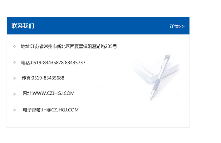 地址:常州市新北區友邦商務大廈1幢16、17層  電話:0519-85101652  傳真:0519-85112595  郵編:213022  網址:www_cz-jiayue_cn.gzjingsheng.com  郵箱:xiajifengaa@163.com